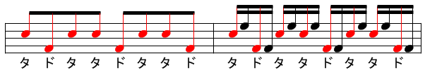 2小節目のフレーズを叩くときに、1小節目と同じ8分音符を歌うことで(赤い部分)、