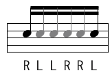 真ん中のダブル(LLRR)を、足のシングル(RLRL)に置き換えた形が右の譜面。