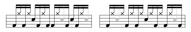 「バスドラムの次は必ず右手からシングルストローク」というルールを決めます。こうすることで、バスドラムやバックビートがどの位置にあっても、迷わずにリニアを構築することができます。