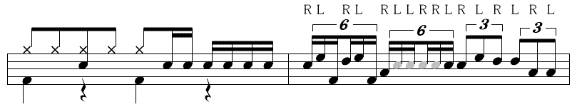 6連→3連のように、音符の割り方を変えることでリズムに緩急がつきます。前後のビートとのつながりが悪くならないように、リズムチェンジの仕方を工夫しましょう。